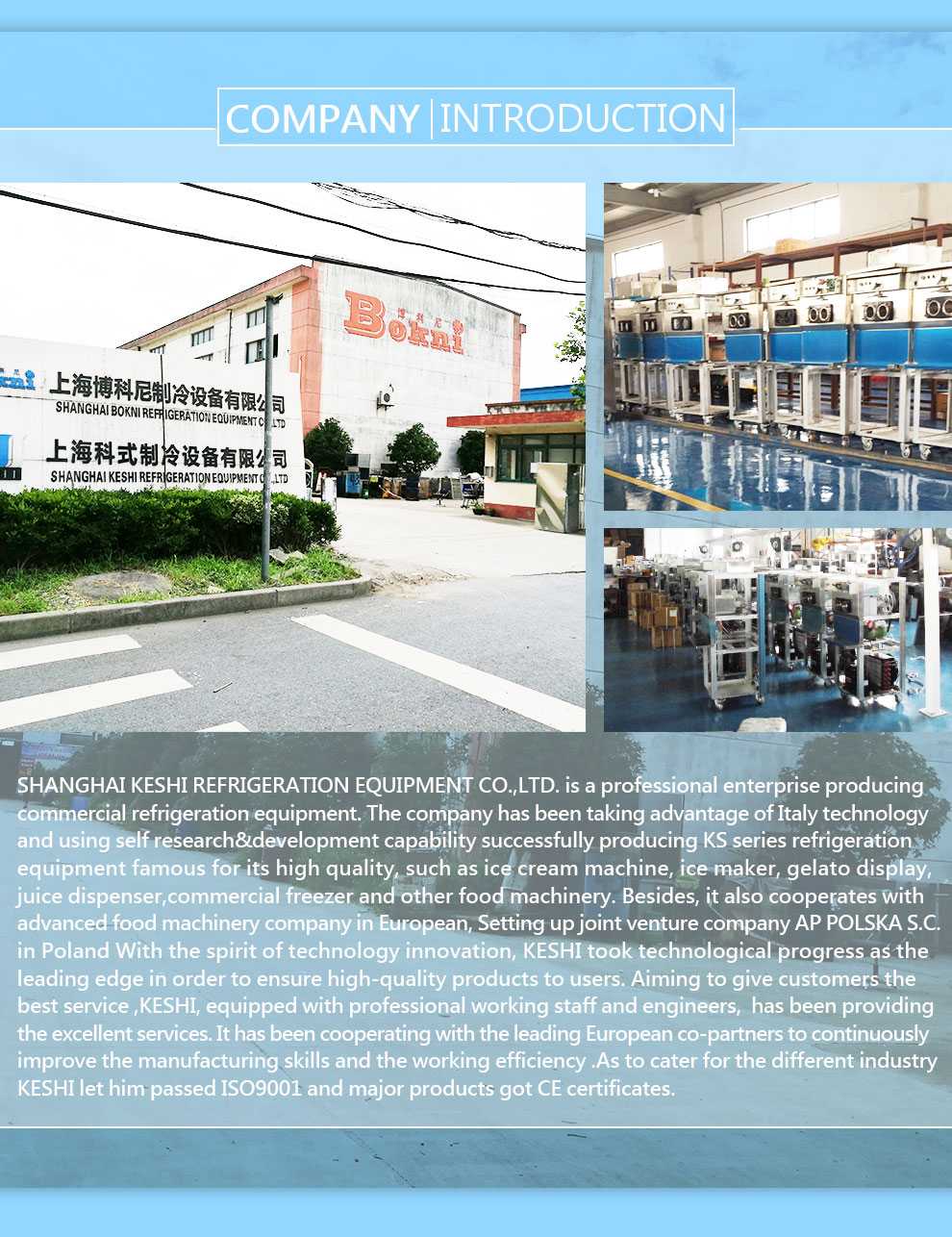 Shanghai Keshii Refrigeration Equipment Company,(previous company is Shanghai Yachu company).as a leader of refrigeration equipment, has been designing,researching, developing, manufacturing refrigeration equipments since 2002 year all of products are approved CE and ISO9001 certificates. It is famous in Shanghai because of Prior quality and close aftersales service.